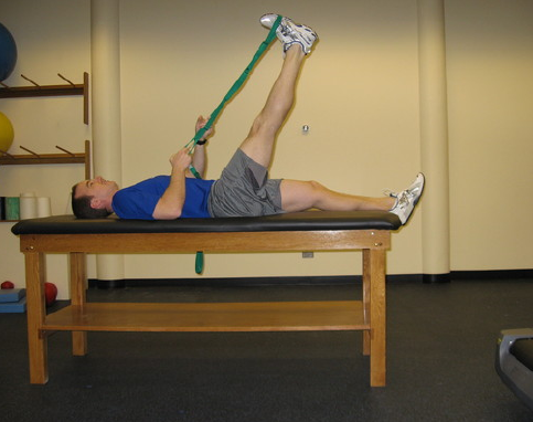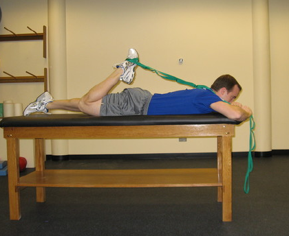 Quad Stretch – While laying on your stomach, place a strap (a looped belt or towel works well) around your foot. Pull your heel towards your rear until a stretch is felt across the front of the thigh. Hold this for 30 seconds and repeat 3-5 times.