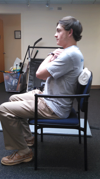 Sitting in a chair, place a firmly rolled up towel horizontal to your mid back region. Then with your arms crossed over your chest, arch back over the towel to improve flexibility within your thoracic spine. Make sure to keep your head and neck still to prevent strain into your neck during this stretch. You can also adjust the position of the towel to specifically target areas that are more stiff.