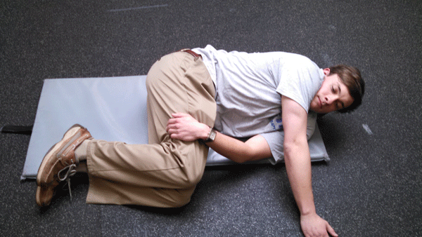 Start by laying on the ground with your knees pulled up toward your chest. With your hand that is next to the ground, grasp the top of your knees to stabilize your trunk and low back. Then with the top arm straight in front of your body, rotate your trunk to stretch your thoracic spine.