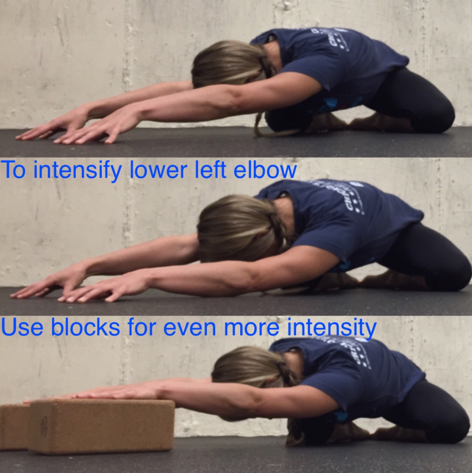 Tip: if you want to intensify the stretch you can lower just the left elbow towards the floor, but keep the thumbs even as shown in the middle photo. For even more intensity you can place your hands on yoga blocks, again keeping the hands even, and lower the left elbow towards the floor as shown in the bottom photo.