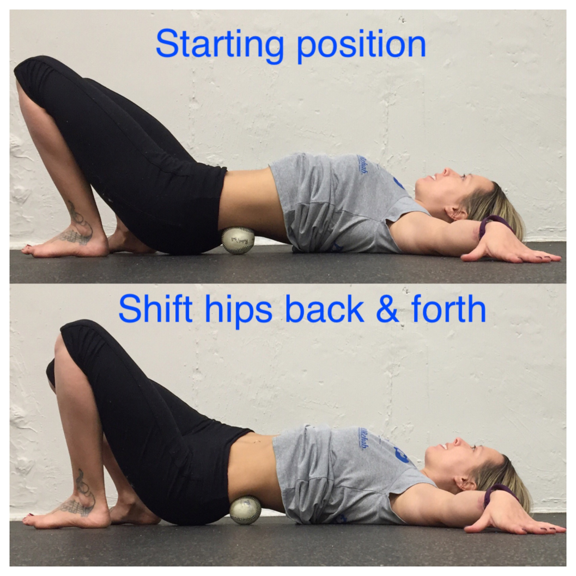 3. You can let the ball stay in a particular spot or start to move the hips gently back and forth (or up and down) to massage along the soft tissue, as shown in the bottom photo. You can massage each side of the low back for 10-15 minutes at a time. Avoid going longer as this may cause increased soreness, especially if you are not used to it.