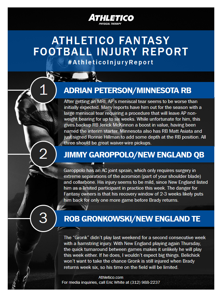 In this week’s edition of the #AthleticoInjuryReport, Jacob is providing insights into Adrian Peterson, Jimmy Garoppolo and Rob Gronkowski’s injuries. Learn more by checking out the infographic below (click to enlarge):