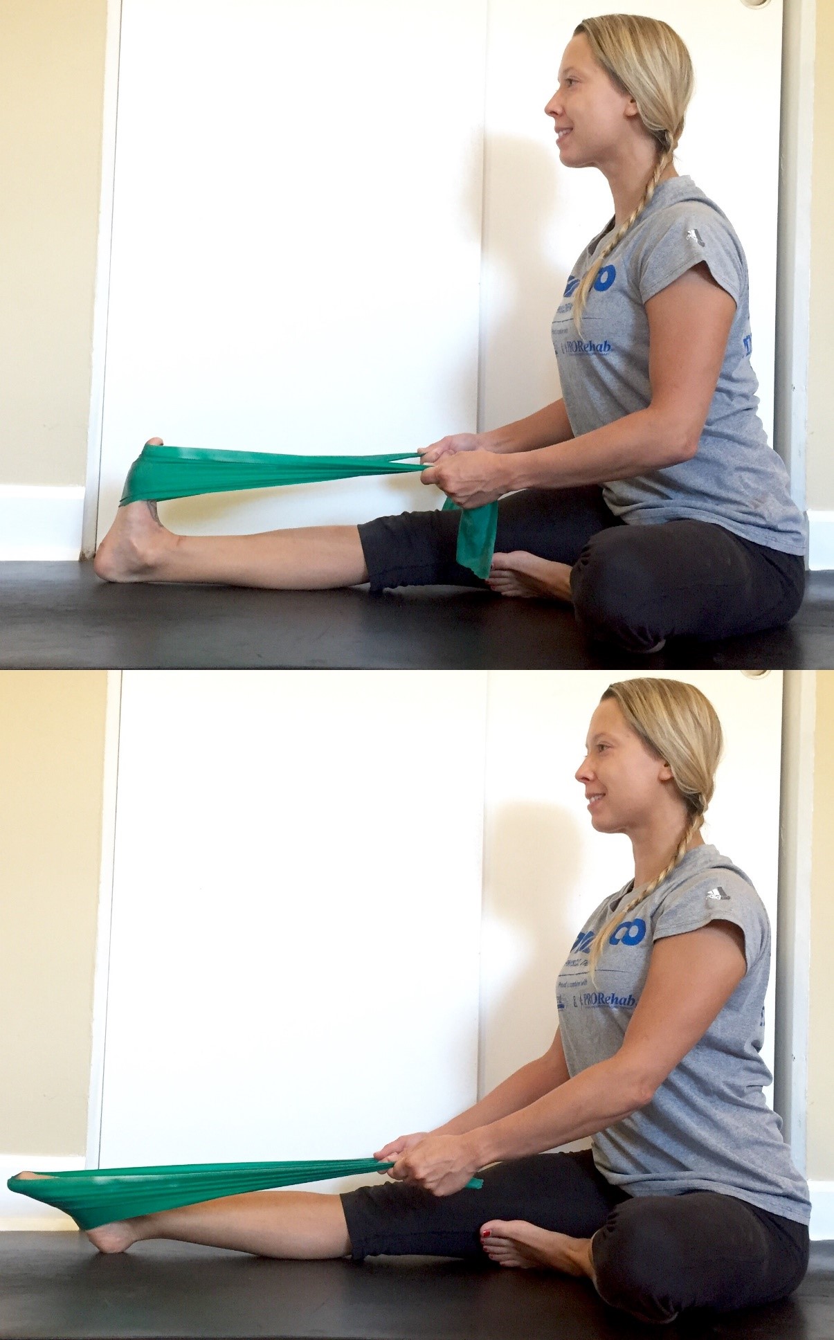 1. From a seated position, extend your right leg straight. Place the resistance band around the top part of your foot. Flex the foot, bring your toes toward your face and gently apply resistance by bending your arms slightly. You should feel some stretch through the bottom of your foot and calf. This will also contract the shin muscles, strengthening them. Sit tall by pulling your belly button to your spine. Make sure your heel stays on the floor. Hold for an inhale and exhale. View a demonstration of this step in the top photo.