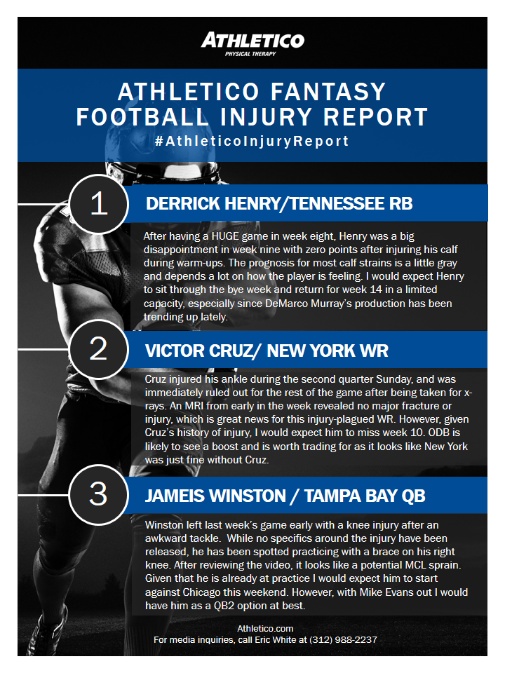 In this week’s edition of the #AthleticoInjuryReport, Jacob is shedding light on the injuries impacting Derrick Henry, Victor Cruz and Jameis Winston. Learn more by checking out the infographic below (click to enlarge):