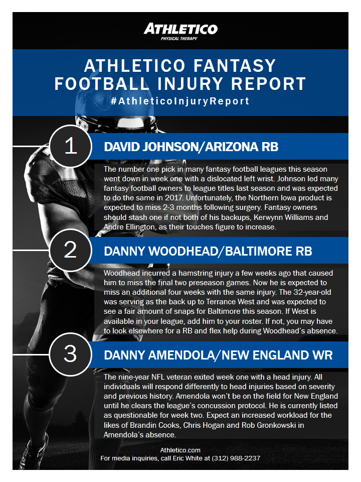 In this week’s edition of the #AthleticoInjuryReport, Brandon is offering insights to those who have David Johnson, Danny Woodhead or Danny Amendola on their team. Learn more by checking out the infographic below (click to enlarge):