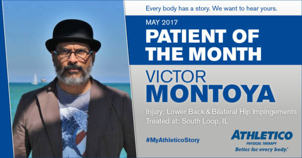 Victor ended up at Athletico South Loop for lower back issues and bilateral hip impingements. Victor’s therapist, Kelli Barton, took a holistic approach to his treatment and initiated the therapy regiment that Victor’s doctor requested with modifications when needed.