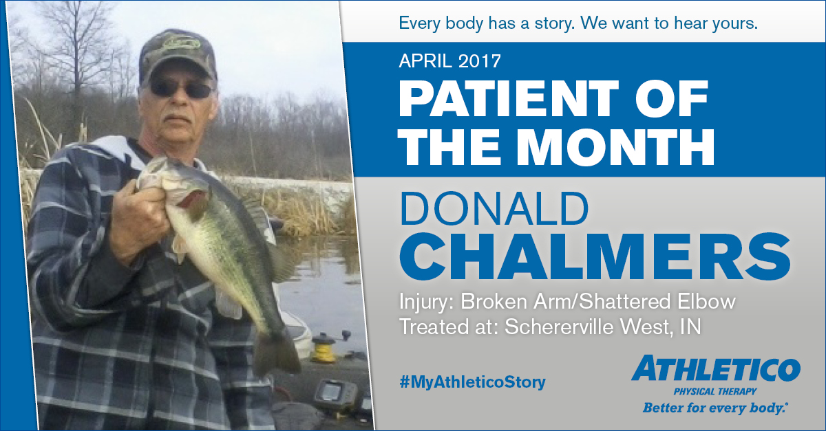 The trauma team was able to save Donald’s arm, but he ended up with two plates, two wires and a titanium elbow that was held together by 32 screws. Although Donald was grateful to have his arm, his doctor told him he would never work again. Donald then asked to be referred to the best therapist close to his home, and Gloria from Athletico Schererville West was highly recommended.