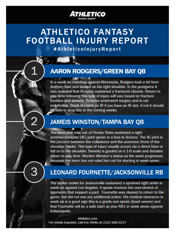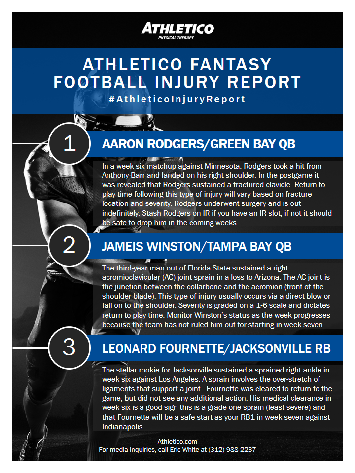 In week seven’s edition of the Athletico Fantasy Football Injury Report, Brandon is providing some advice to those who have Aaron Rodgers, Jameis Winston and Leonard Fournette on their teams. Learn more by checking out the infographic below (click to enlarge):