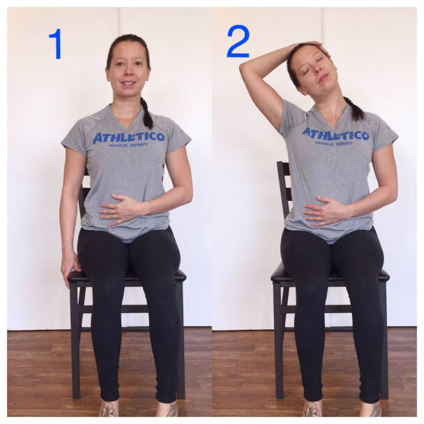 1. Take a seat in a chair. This stretch can also be performed standing if needed. Place your left hand across your stomach area as shown in photo 1.