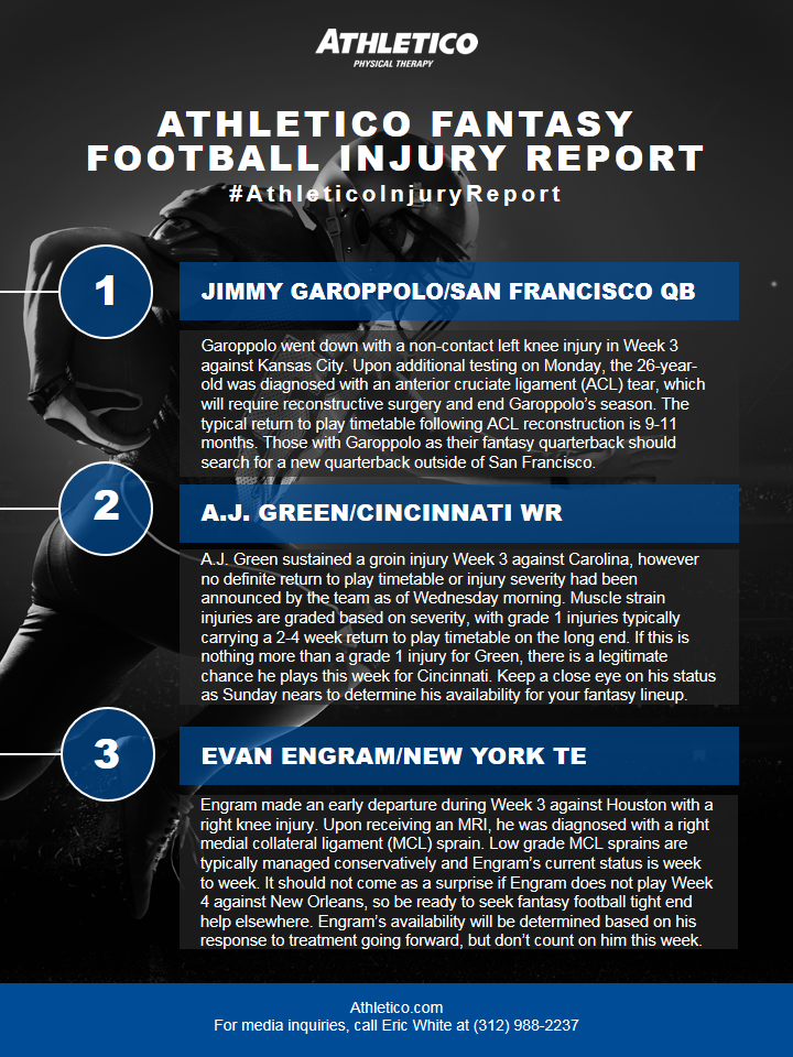 In this edition of the #AthleticoInjuryReport, Brandon is shedding light on the injuries impacting Jimmy Garoppolo, A.J. Green and Evan Engram. Learn more by checking out the infographic below (click to enlarge):