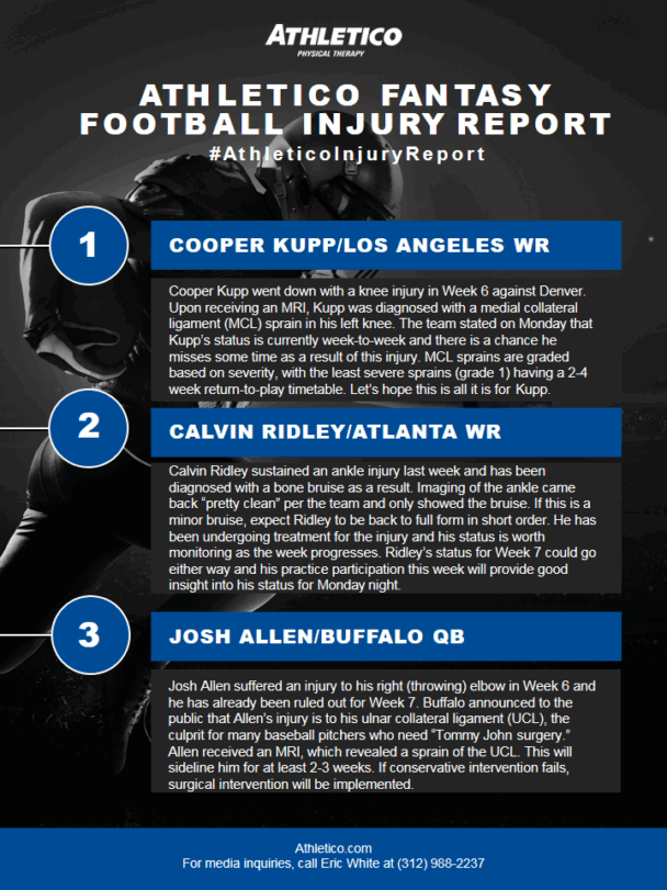 In this week’s edition of the #AthleticoInjuryReport, Brandon is highlighting the injuries impacting Cooper Kupp, Calvin Ridley and Josh Allen. Learn more by checking out the infographic below (Click to enlarge):