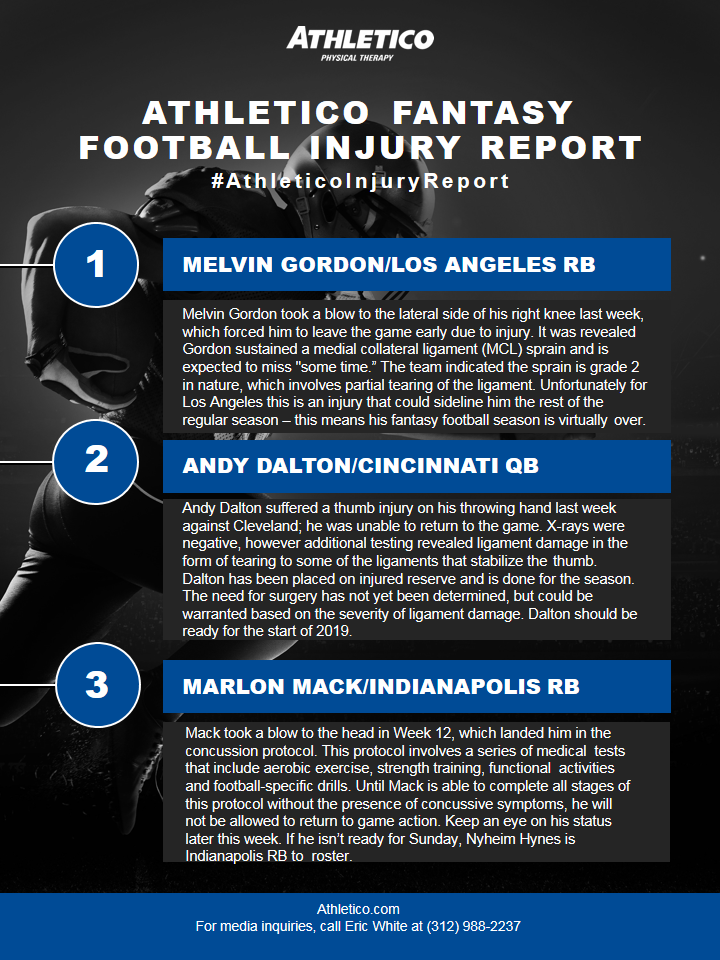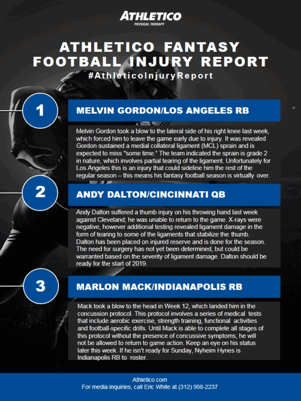 In this week’s edition of the #AthleticoInjuryReport, Brandon is discussing the injuries impacting Melvin Gordon, Andy Dalton and Marlon Mack. Learn more by checking out the graphic below (click to enlarge):