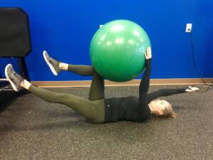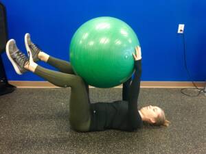4. Physioball Holds Level 1 – Hold a physioball between your hands and knees. Make sure to maintain your head in a chin tucked position, your lower spine flat against the ground, and your feet above the level of your knees. Hold this position for 5-10 breath cycles.