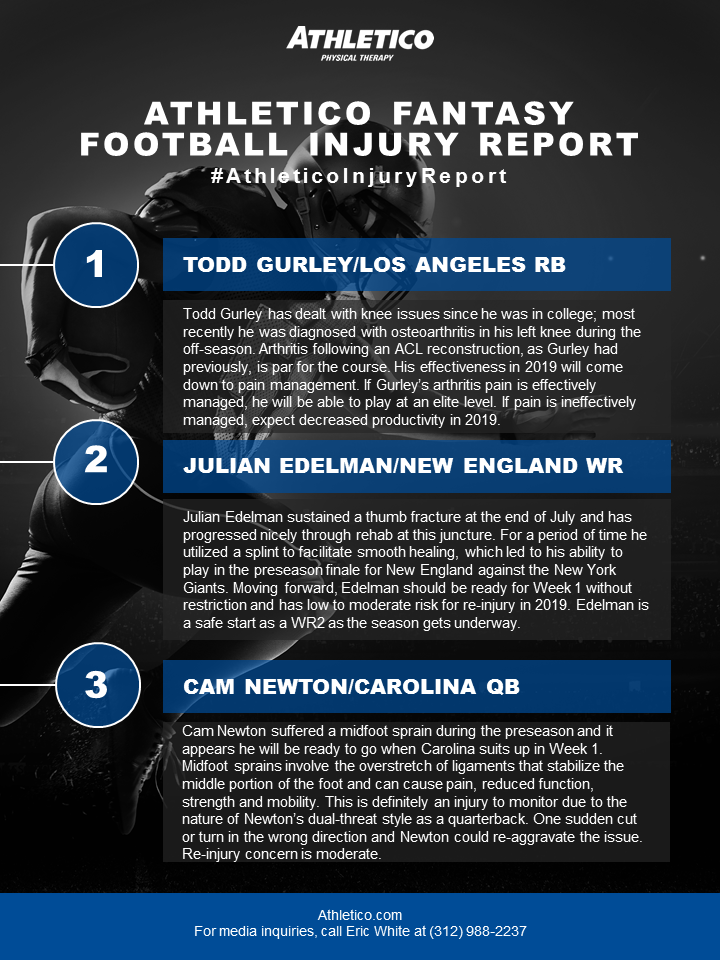 In this week’s #AthleticoInjuryReport, Brandon is reviewing the injuries impacting Todd Gurley, Julian Edelman and Cam Newton. Learn more by checking out the infographic below (click to enlarge):