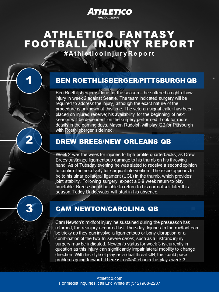 In this week’s edition of the #AthleticoInjuryReport, Brandon is shedding light on injuries impacting some of the league’s most well-known quarterbacks, including Ben Roethlisberger, Drew Brees and Cam Newton. Learn more by checking out the infographic below (click to enlarge):