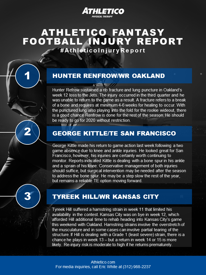 In this week’s #AthleticoInjuryReport, Brandon is discussing the injuries impacting Hunter Renfrow, George Kittle and Tyreek Hill. Learn more by checking out the infographic below (click to enlarge).