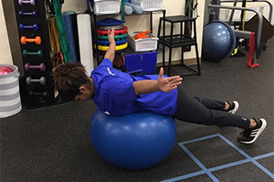 • Scapular muscles (shoulder blade muscles): middle and lower trapezius muscles control shoulder blade movement. To strengthen these muscles, try performing “Ts” and “Ys” on a therapy ball.