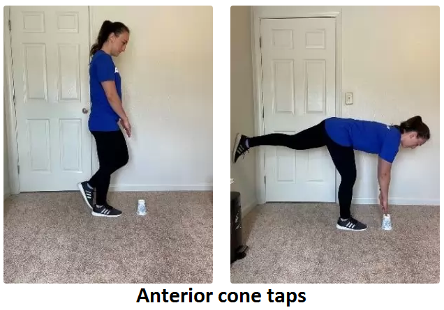 This exercise is good for strengthening the core, gluteal, and hamstring muscles and challenges your balance. Place a cone (or a cup upside down) about 12 inches in front of you. Stand on one leg, slowly hinge at your hip and reach towards the cone. Be sure to keep your back straight and your knee slightly bent. Perform 2-3 sets of 10 repetitions on each leg.