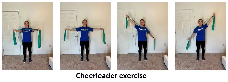 This exercise is good for strengthening your shoulder muscles and improving your posture. Hold onto a resistance band with your elbows straight. Pull the resistance band apart. Return to the starting position. Pull the resistance band to a diagonal. Return to the starting position and pull to the opposite diagonal. Perform 3 sets of 10 repetitions.