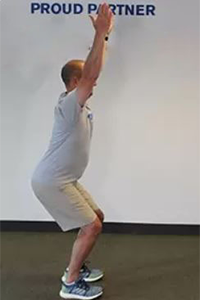 4. Squat with overhead press: Start with feet shoulder width apart and arms at sides. Sit back to squat ensuring knees are in line and behind toes. Raise arms to the ceiling to challenge stability. When descending do not allow back to arch. As you stand up out of the squat press your arms toward the ceiling. Perform three sets of 10 repetitions. Progress by adding a weighted object to one or both hands.