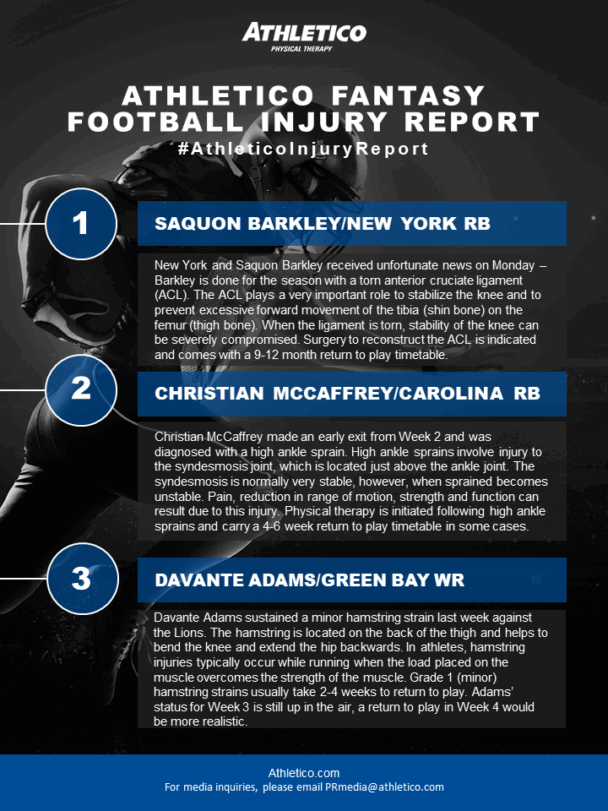 In this week’s edition of the #AthleticoInjuryReport, Brandon is shedding light on injuries impacting Saquon Barkley, Christian McCaffrey and Davante Adams. Learn more by checking out the infographic below (click to enlarge):