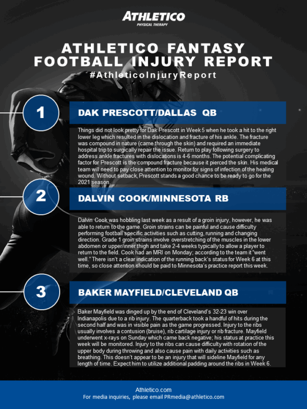 In this week’s edition of the #AthleticoInjuryReport, Brandon is shedding light on injuries impacting well-known quarterbacks, Dak Prescott and Baker Mayfield as well as Minnesota RB, Dalvin Cook. Learn more by checking out the infographic below (click to enlarge):