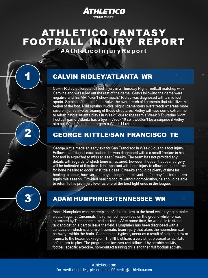 In this week’s #AthleticoInjuryReport, Brandon is discussing foot injuries along with a concussion that have impacted Calvin Ridley, George Kittle and Adam Humphries. Learn more by checking out the link below (click to enlarge):