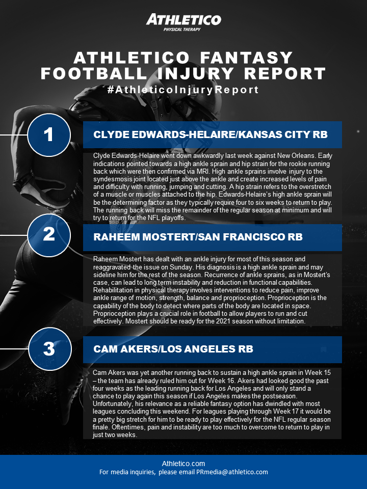 During Week 16 of the #AthleticoInjuryReport, Brandon discusses ankle sprains plaguing a handful of running backs including: Clyde Edwards-Helaire, Raheem Mostert and Cam Akers. Learn more by checking out the infographic below (click to enlarge):