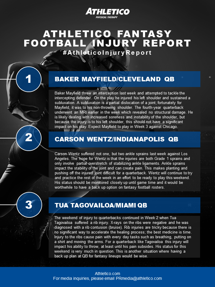 Each week, Athletico’s Brandon Bowers, PT, DPT, Astym Cert. highlights noteworthy injuries in the Athletico Fantasy Football Injury Report. Injuries to players, especially quarterbacks, can heavily influence your lineup and your overall game performance.