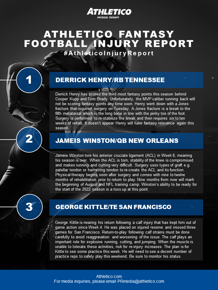 In this week’s #AthleticoInjuryReport, Brandon is discussing injuries impacting Derrick Henry, Jameis Winston, and George Kittle. Learn more by checking out the link below (click to enlarge):