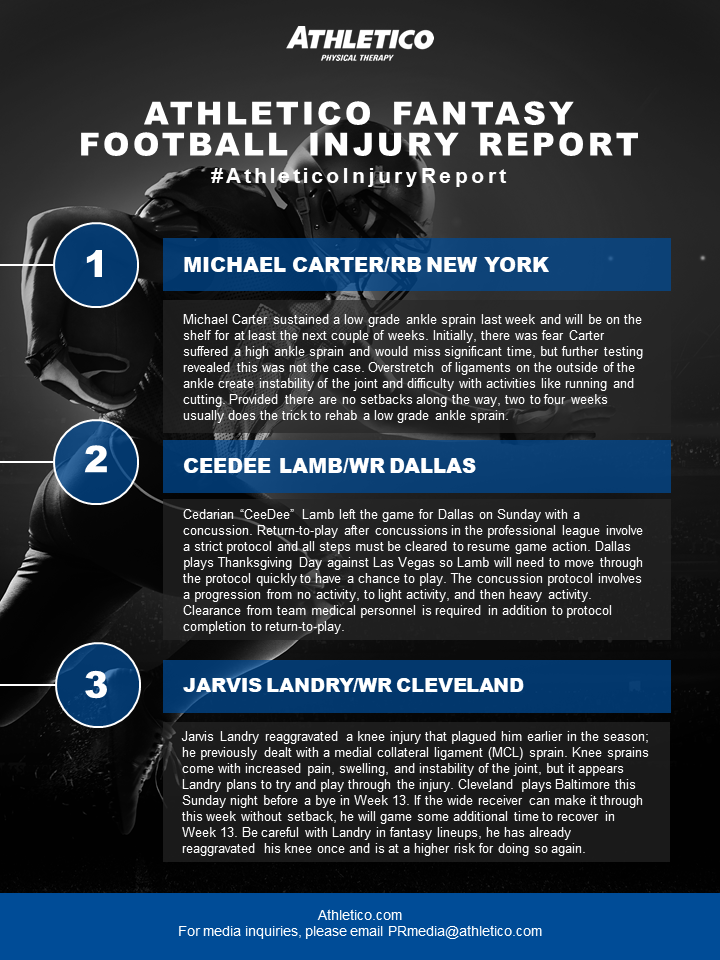 In this week’s edition of the #AthleticoInjuryReport, Brandon is discussing the injuries impacting running back Michael Carter and wide receivers, CeeDee Lamb and Jarvis Landry. Learn more by checking out the infographic below and Happy Thanksgiving from all of us here at Athletico!