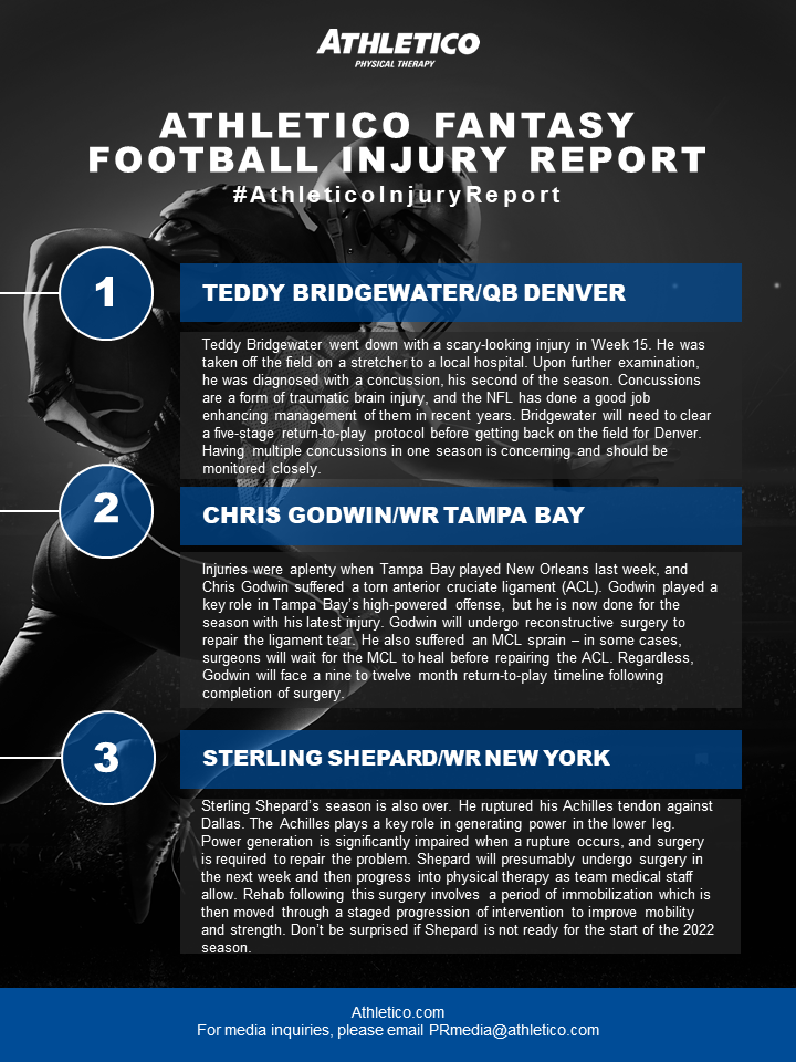 During Week 16 of the Athletico Fantasy Football Injury Report, Brandon discusses the injuries impacting Teddy Bridgewater, Chris Godwin, and Sterling Shepard. Learn more by checking out the infographic below (click to enlarge):
