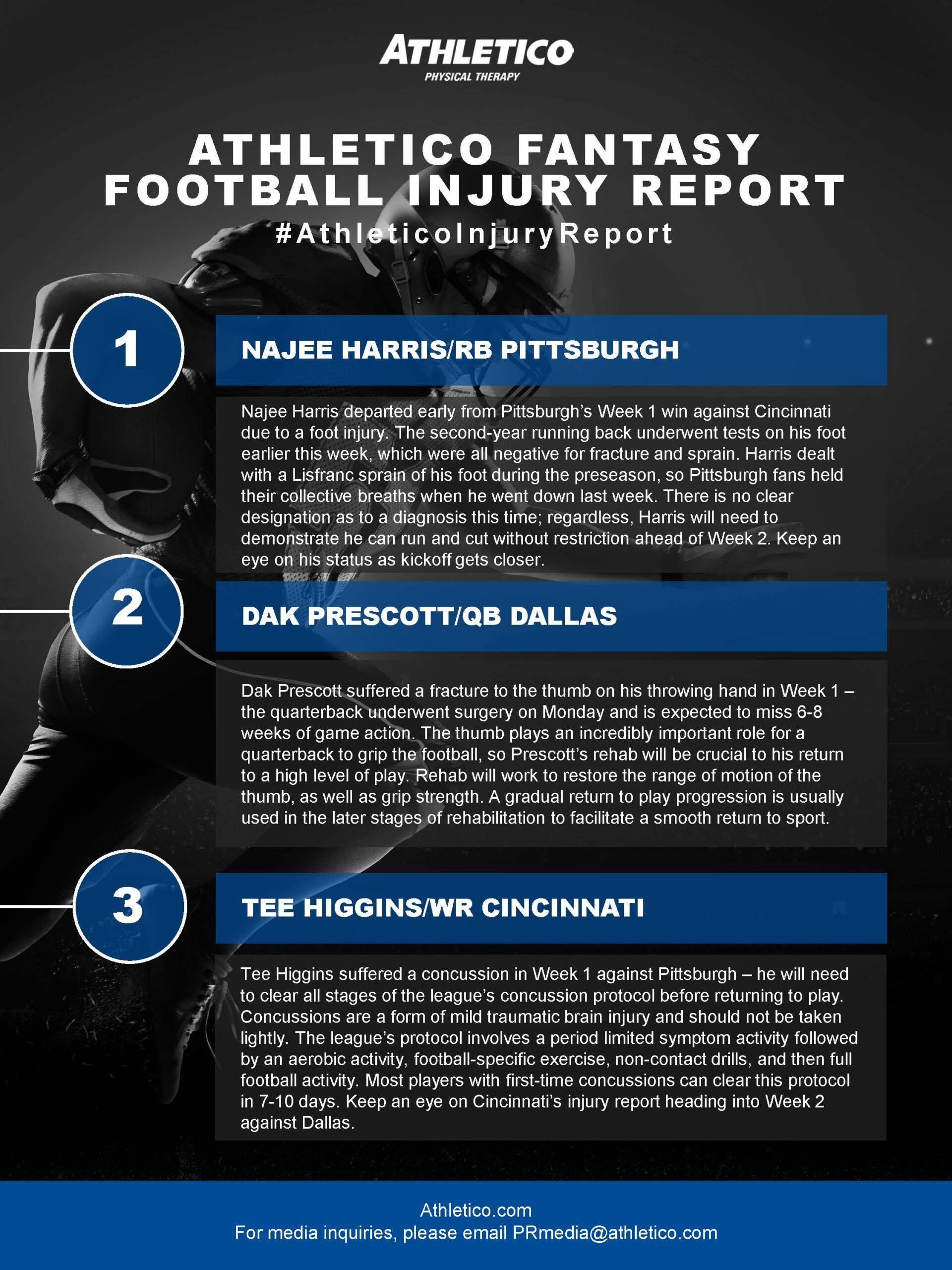 In this week’s edition of the #AthleticoInjuryReport, Brandon is shedding light on injuries impacting Najee Harris, Dak Prescott, and Tee Higgins. Learn more by checking out the infographic below (click to enlarge):