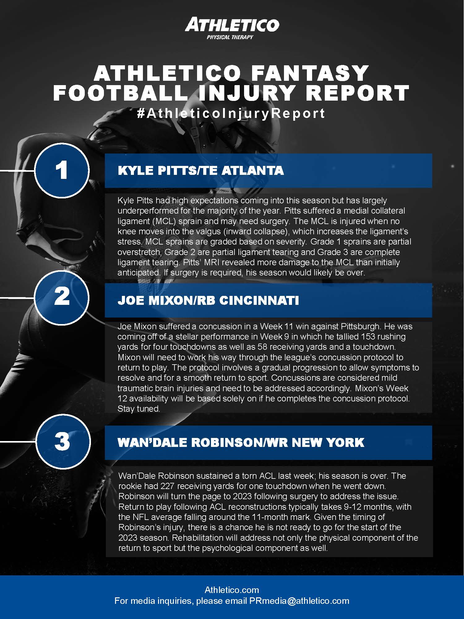 In this week’s edition of the #AthleticoInjuryReport, Brandon is discussing the injuries impacting tight end Kyle Pitts, running back, Joe Mixon and wide receiver Wan’Dale Robinson. Learn more by checking out the infographic below and Happy Thanksgiving from all of us here at Athletico!