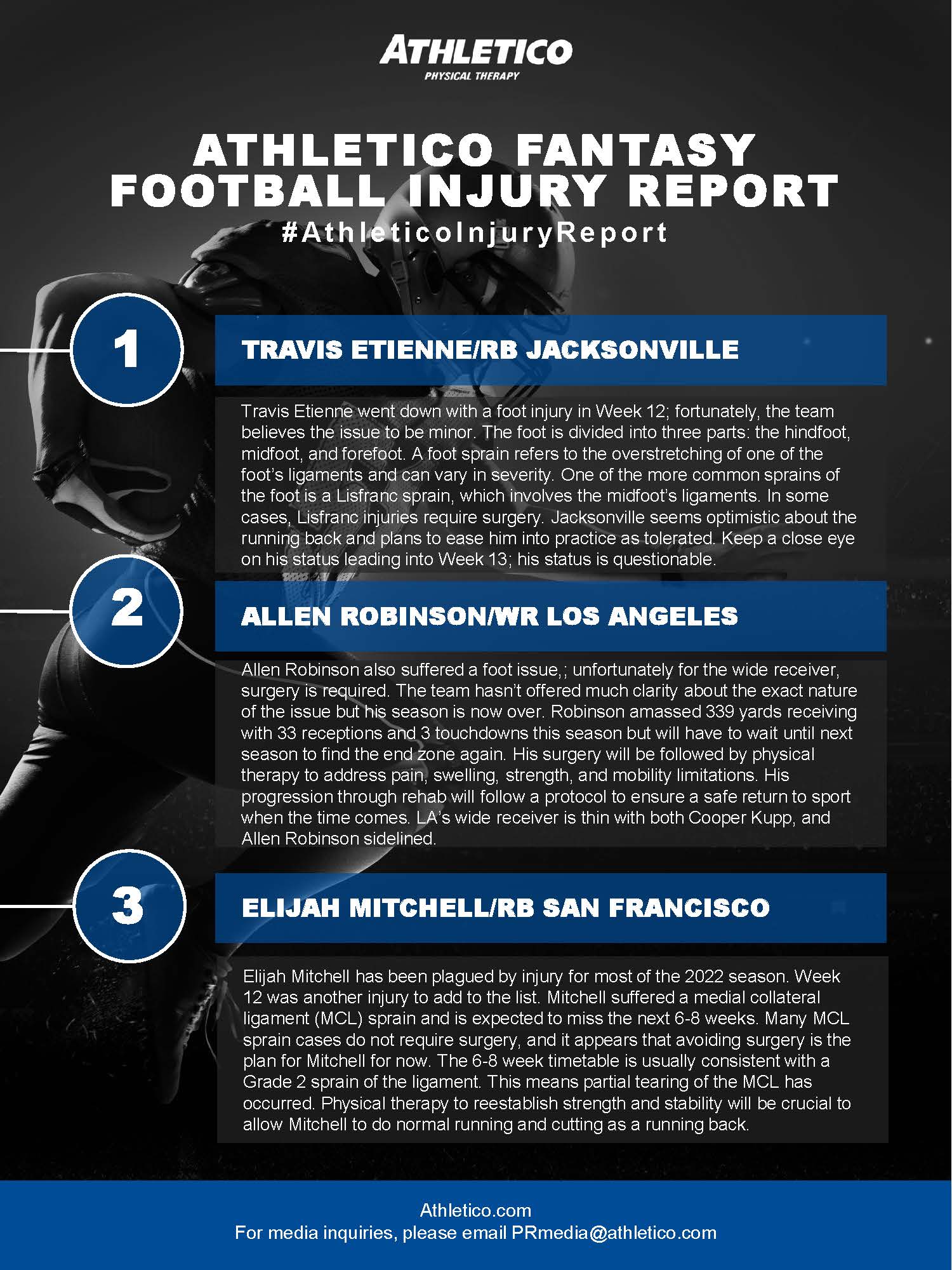 In this week’s running back edition of the Athletico Fantasy Football Injury Report, Brandon discusses the injuries impacting Travis Etienne, Allen Robinson, and Elijah Mitchell. Learn more by checking out the infographic below (click to enlarge):