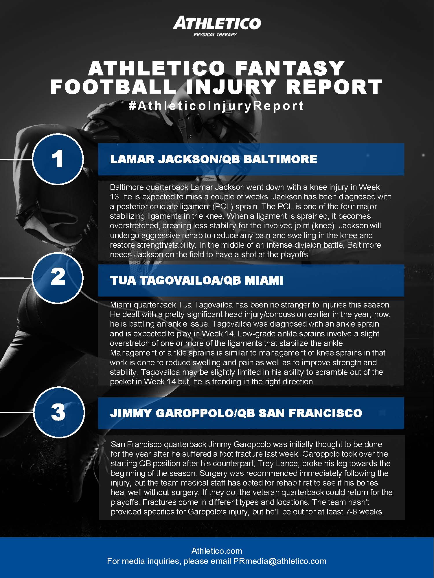 In this week’s edition of the Athletico Fantasy Football Injury Report, Brandon discusses the injuries impacting Lamar Jackson, Tua Tagovailoa, and Jimmy Garoppolo. Learn more by checking out the infographic below (click to enlarge):