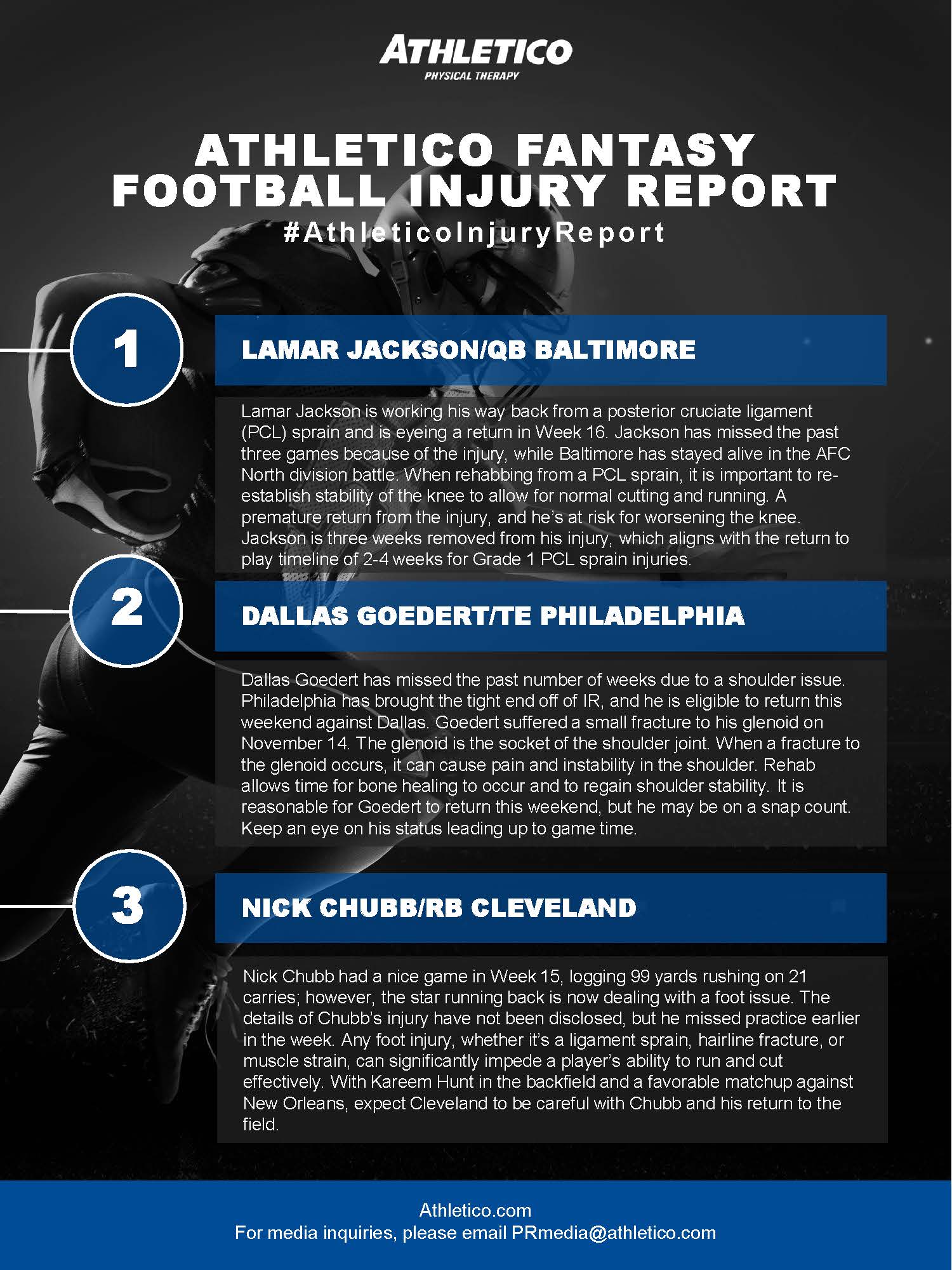 During Week 16 of the Athletico Fantasy Football Injury Report, Brandon discusses the injuries impacting Lamar Jackson, Dallas Goedert, and Nick Chubb. Learn more by checking out the infographic below (click to enlarge):