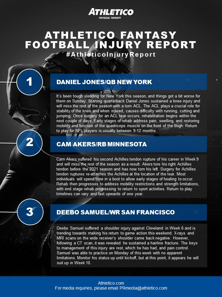 In this week’s edition of the #AthleticoInjuryReport, Brandon is discussing the injuries impacting Daniel Jones, Cam Akers, and Deebo Samuel. Learn more by checking out the infographic below (click to enlarge):