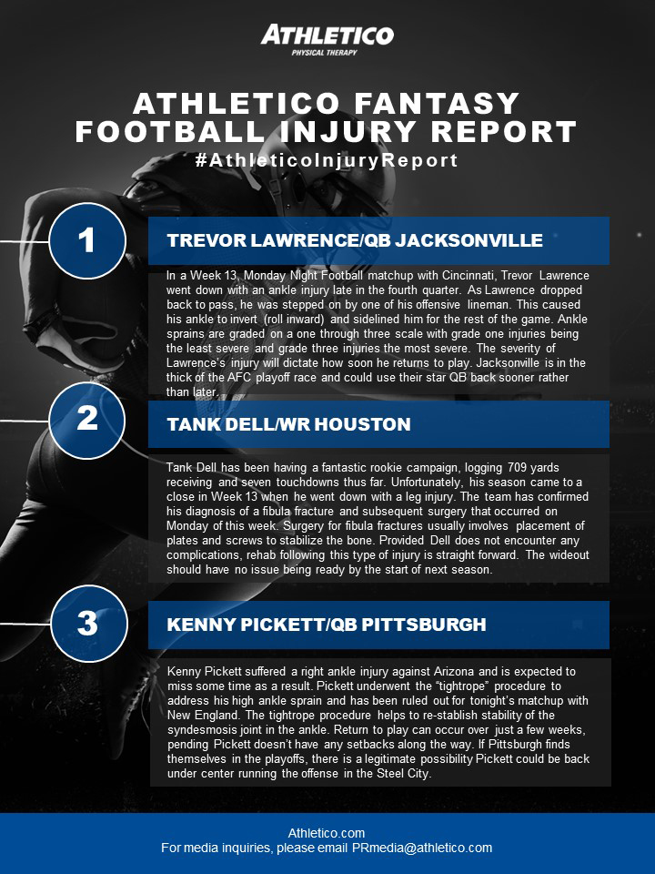 In this week’s edition of the #AthleticoInjuryReport, Brandon discusses the injuries impacting Trevor Lawrence, Tank Dell, and Kenny Pickett. Learn more by checking out the infographic below (click to enlarge):