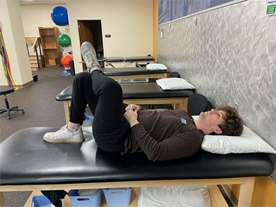 Start by lying flat on your back with your knees bent and feet together. Slowly let your knees move together to one side toward the surface you are lying on. The distance the knees need to move to feel a stretch depends on the individual. Some individuals move their knees very little to feel a stretch, and others have to move their knees much further. The stretch should be felt in the lower back/hip region on the side opposite the knees are moving. Hold this position for 30 seconds and then repeat on the other side. Perform four repetitions per side.