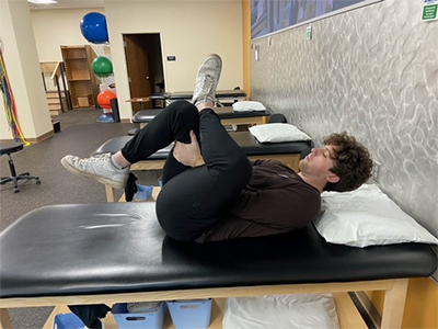 Start by lying flat on your back with your knees bent. Next, cross one leg over the other so the outside ankle bone rests on the thigh of your other leg. With both hands, grasp the back side of the thigh of the uncrossed leg and pull your legs towards your chest. The stretch should be felt on the outside of the hip of the crossed leg. Hold this position for 30 seconds and then repeat on the other side. Perform four repetitions per side.