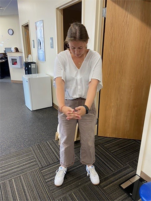 Directions: Sit in a chair with your feet flat on the floor. Place your right hand on the outside of your left thigh and gently twist your torso to the left, using your left hand to hold the back of the chair for support. Keep your back straight and look over your left shoulder. Hold for 30 seconds, then switch sides and repeat. Repeat this stretch 4 times on each side.