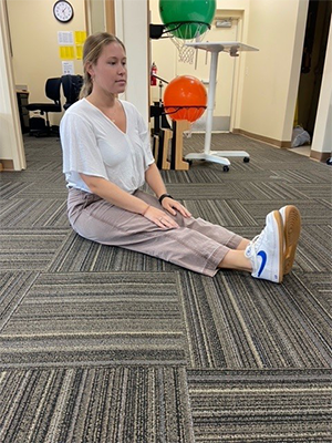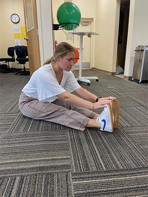 Directions: Sit on the floor with your legs extended straight in front of you. Reach forward with your hands towards your feet, keeping your back as straight as possible. Hold the position where you feel a comfortable stretch, not pain, for 30 seconds. Relax and sit up slowly. Repeat this stretch 4 times.