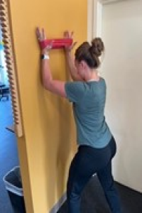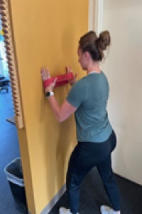 This exercise aims to drive the bottom tip of your shoulder blade into your back pocket while lifting your hand off the wall.