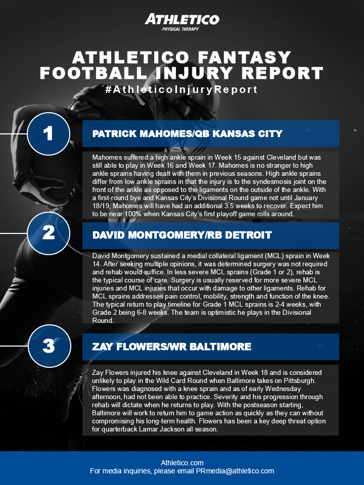 After 18 weeks of teams going head-to-head on the field, the Fantasy Football season has officially come to an end. Athletico’s Brandon Bowers, PT, DPT, ASTYM Cert. shares the final #AthleticoInjuryReport of the season where he discusses injuries impacting Patrick Mahomes, David Montgomery, and Zay Flowers as we head into playoffs.