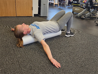 Starting Position: Begin lying on a foam roller. Support your neck on the roller with your arms raised to shoulder height and your elbows straight.