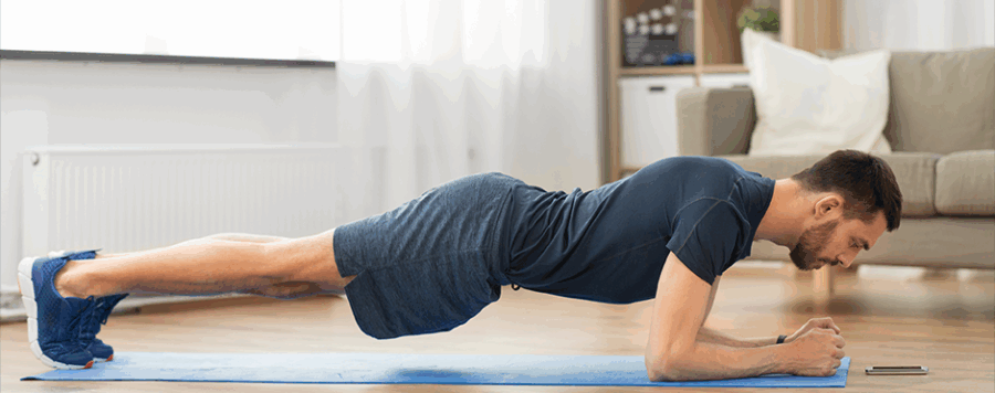 Get onto the floor, supporting yourself on your toes and forearms. Tighten your core and maintain a straight line from head to heels. Hold the position for 30-60 seconds, focusing on deep, steady breaths. Perform three sets. To increase the difficulty of planks, try lifting one leg or arm at a time or switching to a side plank.