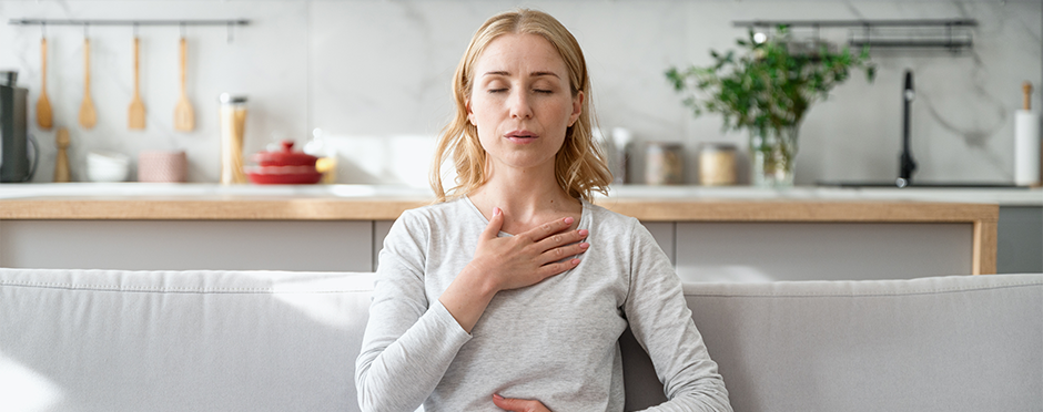 1. Breathe in and out through your nose (If you have difficulty breathing through your nose both on the inhale and exhale, try to breathe in through your nose and out through your mouth with a longer exhale).