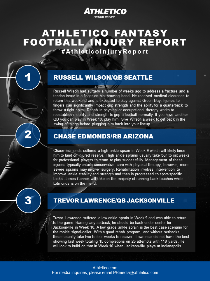 In this week’s edition of the #AthleticoInjuryReport, Brandon is discussing the injuries impacting notable quarterbacks, Russell Wilson, and Trevor Lawrence, along with Arizona running back, Chase Edmonds. Learn more by checking out the infographic below (click to enlarge):